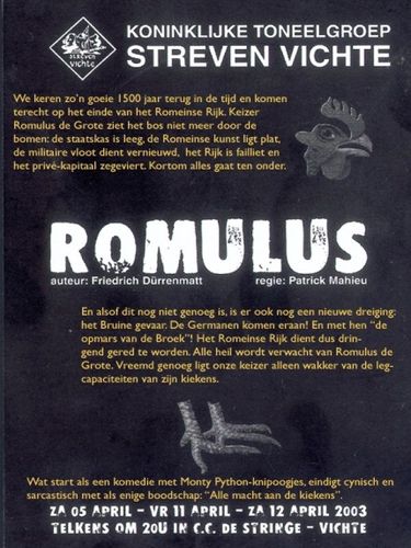 We keren zo'n goeie 1500 jaren terug in de tijd en komen terecht op het einde van het Romeinse Rij. Keizer Romulus de Grote ziet het bos niet meer door de bomen : de staatskas is leeg, de Romeinse kunst ligt plat, de militaire vloot dient vernieuwd, het Rijk is failliet en het privé-kapitaal zegeviert. Kortom alles gaat ten onder.