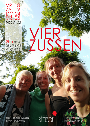Claire Swyzen schetst een fascinerend beeld van 4 zussen van wie de herinneringen verrassend verschillend zijn. Elke zus vertelt en herbeleeft haar memento. Eén enkele dia uit de lader, belicht vanuit een specifiek punt. Soms grappig, soms beklemmend maar voor iedereen herkenbaar. De poëtische tekst van Claire Swyzen onthult beetje bij beetje de dynamiek tussen de vier zussen. Vooral wat niet gezegd wordt, blijkt veelzeggend. Vier zusters is een boeiende vertelling die je meeneemt op een reis in de leefwereld van 4 sterke vrouwen.